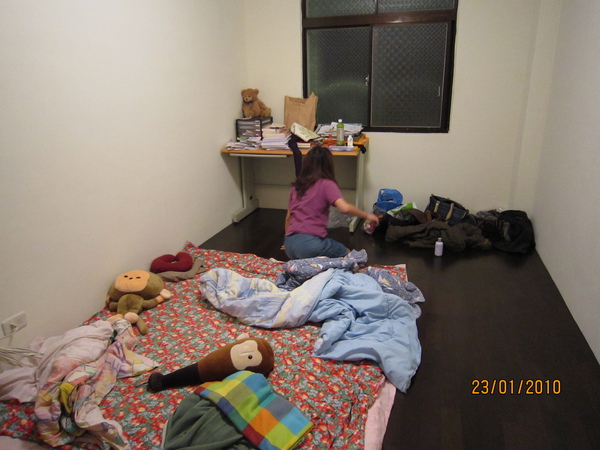 回到家大家開始輪流洗澡 搞到兩點多才入睡 三個人睡在這個棉被上 不會很擠 我很快就入睡了 (P.S圖片中的娃娃不是裝飾品是枕頭,敏ㄦ大姐自己做的)